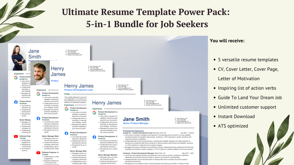 Introducing the Ultimate Resume Power Pack, a 5-in-1 bundle specifically designed for job seekers in consulting, tech, and product management, but of course it can also be used for all kind of jobs. Created by an experienced resume coach and ghostwriter with over 10 years of experience helping people land their dream jobs, these templates have been crafted with the latest industry trends in mind and have proven to be successful in securing interviews at top companies, including Google, Facebook, and Amazon.